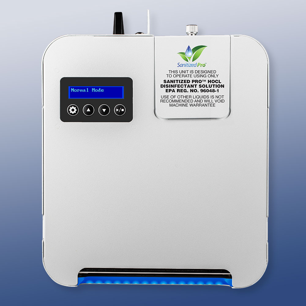 - Sprays a dry mist of EPA Registered Hypochlorous Acid (HOCL) throughout your facility.